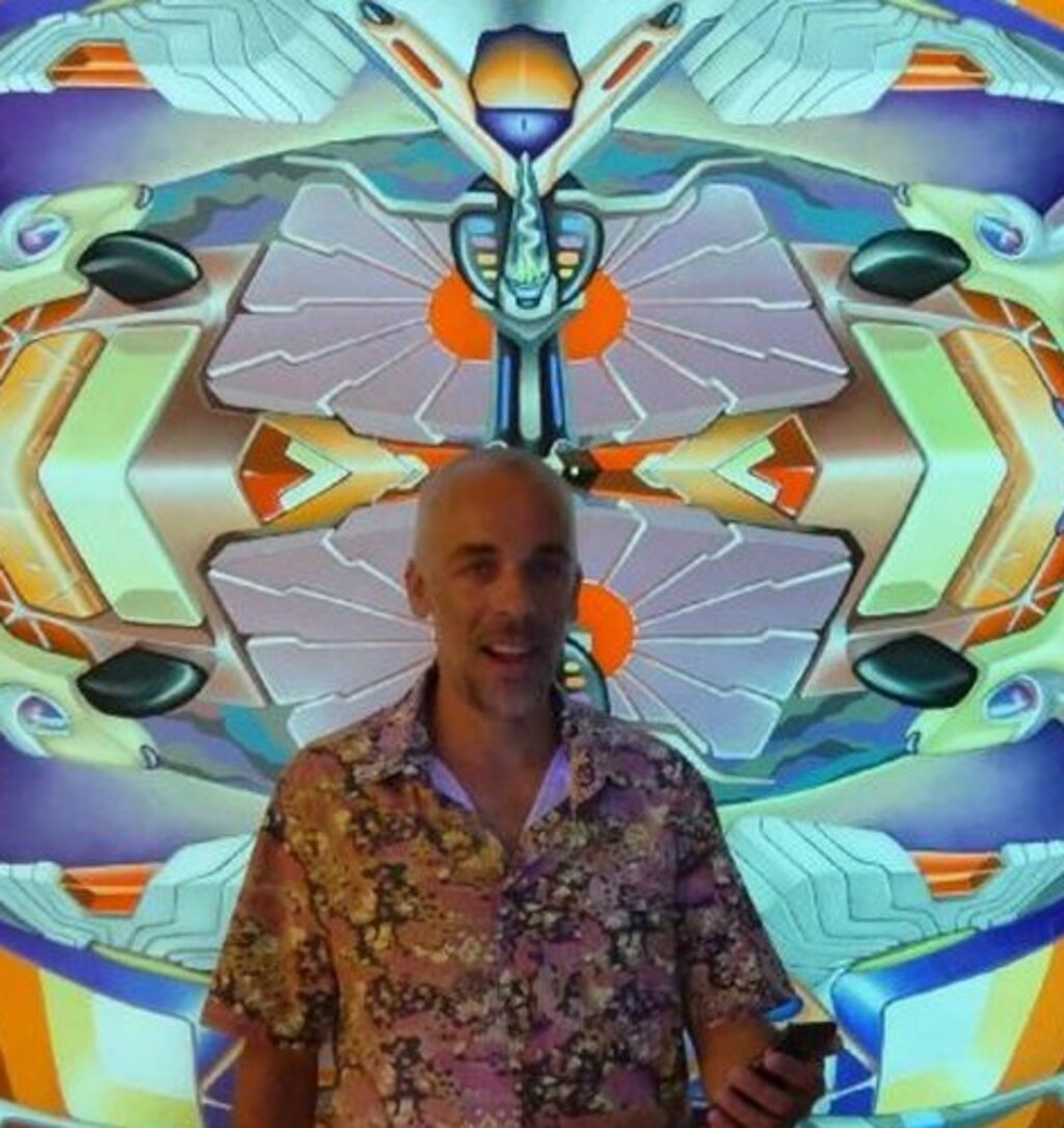 Through symmetry, mirroring systems, and totemic symbolism, his paintings explore ecological mythology and altered perception. Under UV light, the works reveal hidden layers, transforming static images into dynamic, light-activated experiences.